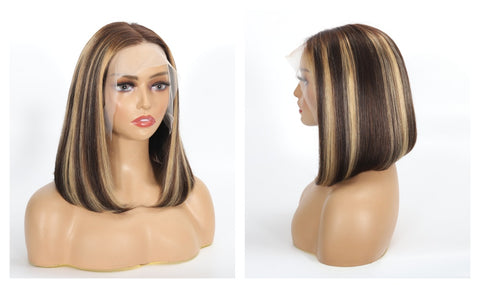 Ombre Brown Piano Color Highlight Lace Front Wig Human Hair Bob Wig Material: Cuticle Aligned Hair 10a Grade Ombre Human Hair Lace Front Wigs Cut From Young Healthy Donor.